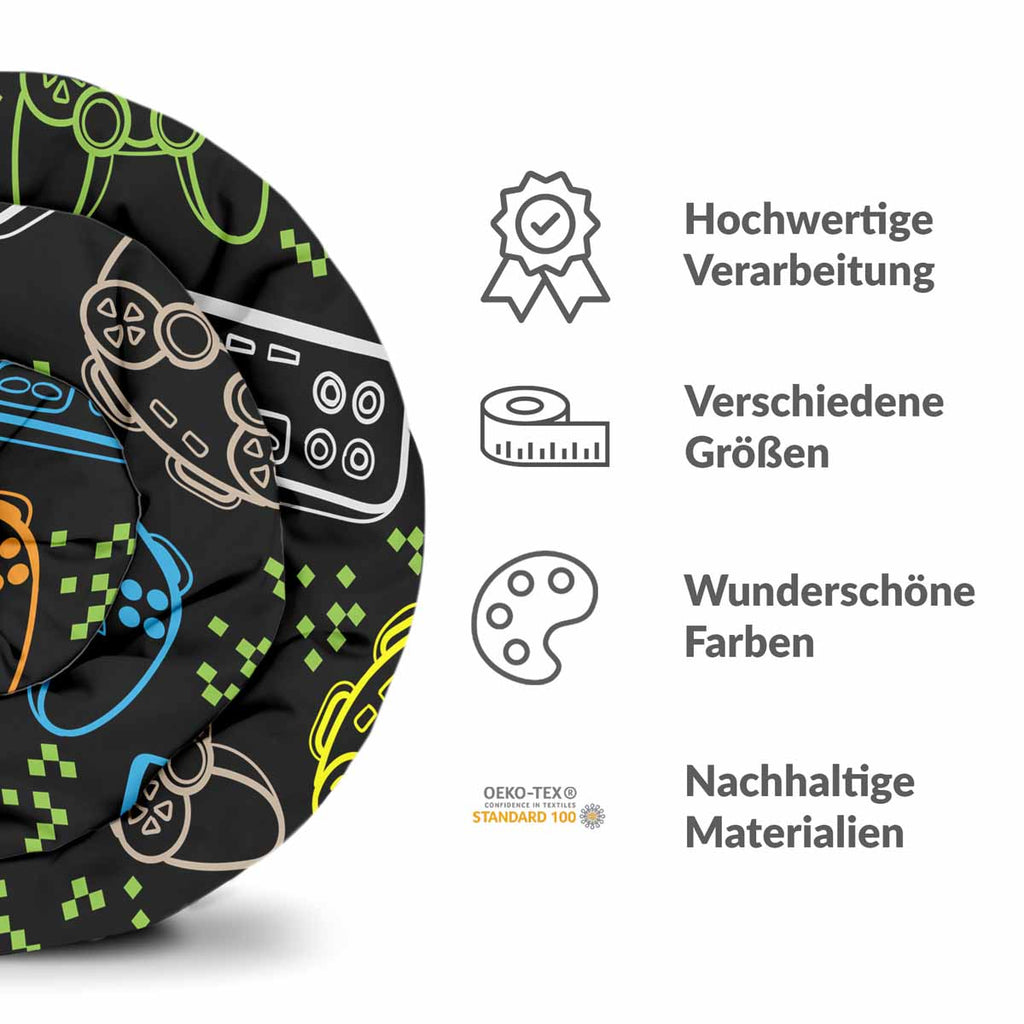Therapy blanket bedding set, black, with game consoles.