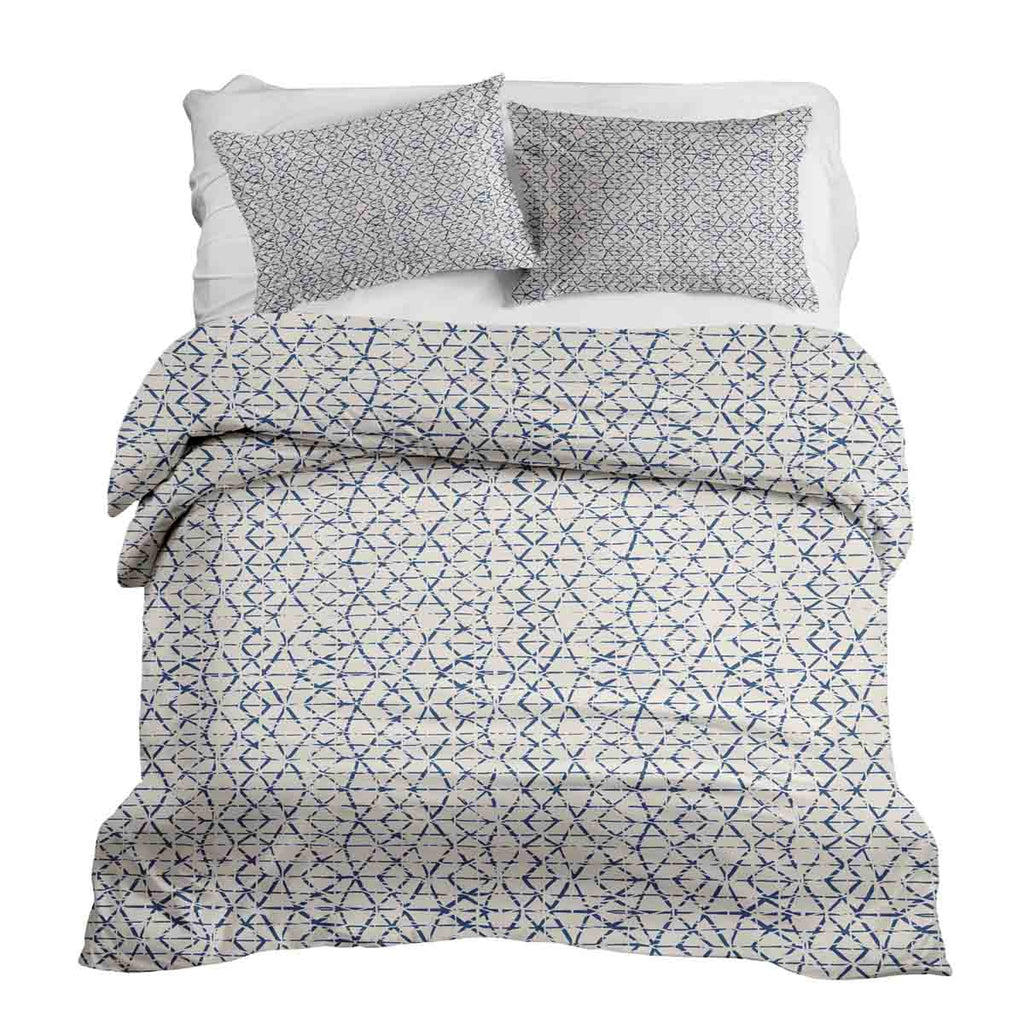 Reviews for Therapy blanket and bedding set, white with delicate blue shapes.