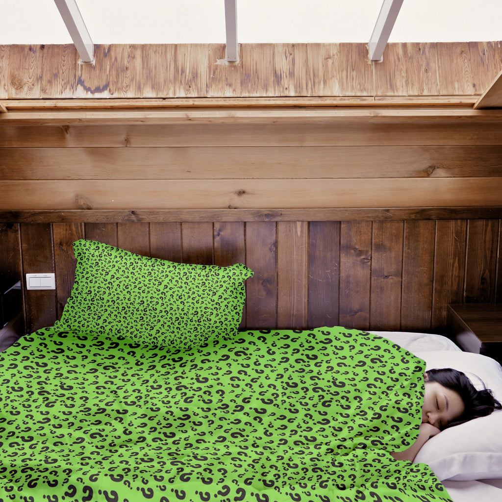 Reviews for Therapy blankets and bedding set, light green with question marks.
